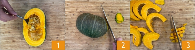 Um die Kürbisflans mit Gorgonzola-Fondue zuzubereiten, nehmen Sie den Kürbis, halbieren ihn, entfernen die Kerne 1, dann schälen Sie ihn 2 und schneiden ihn zuerst in Scheiben und dann in Würfel 3.