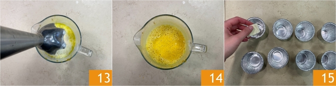 Pürieren Sie mit dem Stabmixer 13, um eine flüssige und glatte Masse zu erhalten 14. Fetten Sie 8 Aluminiumförmchen von 125 ml ein 15.