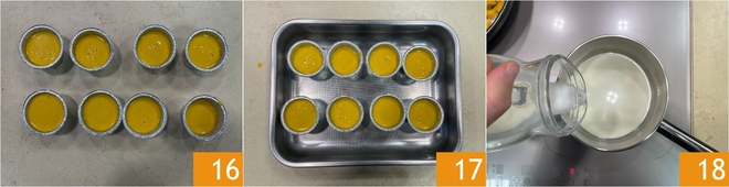 Gießen Sie die Masse hinein, bis etwa einen Fingerbreit unter den Rand 16. Stellen Sie die Förmchen in eine Form mit Wasser zum Wasserbad 17. Backen Sie im vorgeheizten statischen Ofen bei 160° für 35 Minuten. Für die Sauce: Erhitzen Sie Milch und Sahne bis kurz vor dem Kochen 18.