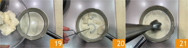 Fügen Sie den in Stücke geschnittenen Gorgonzola hinzu 19 und lassen Sie ihn unter Rühren mit einem Schneebesen schmelzen 20. Für eine glattere Sauce emulgieren Sie alles mit einem Stabmixer bei ausgeschaltetem Feuer 21.