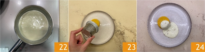 Die Sauce ist bereit 22, nehmen Sie die Kürbisflans mit Gorgonzola-Fondue aus dem Ofen und stürzen Sie sie auf eine Servierplatte 23, dann garnieren Sie mit der Käsesauce 24.
