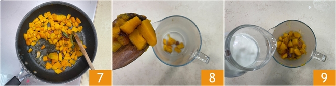 Wenn der Kürbis gar ist 7, geben Sie ihn in den hohen Becher des Mixers 8 mit der Milch 9.