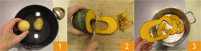 Um die Kürbis-, Ricotta- und Speckhäppchen vorzubereiten, beginnen Sie mit den Kartoffeln, legen Sie sie in einen Topf mit Wasser 1, stellen Sie den Herd an und zählen Sie ab dem Kochpunkt etwa 30/40 Minuten. Währenddessen entfernen Sie die Kerne aus dem Kürbis, schneiden Sie dünne Scheiben von 1 cm Dicke 2 und legen Sie sie in einen Dampfgarer 3. Stellen Sie diesen auf den Topf mit den Kartoffeln und garen Sie etwa 20-25 Minuten: machen Sie zur Sicherheit die Gabelprobe.