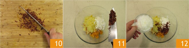 Schneiden Sie den Speck mit dem Messer klein 10. An dieser Stelle verfeinern Sie auch die Ricotta mit dem Kartoffelstampfer in der Schüssel mit Kürbis und Kartoffeln, geben Sie die Speckbrösel 11 und den geriebenen Pecorino 12 dazu.