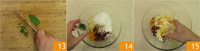 Hacken Sie auch den Salbei mit dem Messer 13, geben Sie ihn in die Schüssel 14 mit Salz, Pfeffer und dem Zimtpulver. Verkneten Sie die Mischung von Hand 15, sie wird kompakt, aber ein bisschen weich.