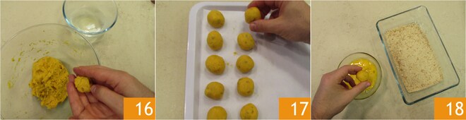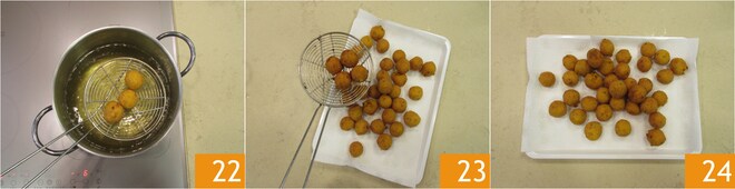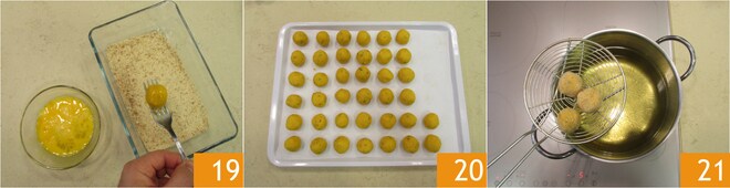 Feuchten Sie Ihre Hände an und formen Sie Häppchen von etwa 15 Gramm 16, so erhalten Sie etwa vierzig Stück. Legen Sie sie nach und nach auf ein mit Backpapier ausgelegtes Tablett und lassen Sie sie eine Stunde im Kühlschrank ruhen 17. Nach dieser Zeit erhitzen Sie das Öl auf 160/170°C und tauchen Sie die Häppchen zuerst in das geschlagene Ei 18