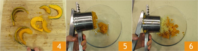 Entfernen Sie die Schale vom Kürbis 4 und zerdrücken Sie ihn mit einem Kartoffelstampfer 5, nehmen Sie auch die Kartoffeln und zerdrücken Sie sie auf die gleiche Weise 6. Lassen Sie sie abkühlen.