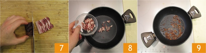Entfernen Sie in der Zwischenzeit die Schwarte vom Speck, falls vorhanden, schneiden Sie ihn dünn auf ein paar mm Dicke 7 und schneiden Sie dann Streifen. Braten Sie sie bei starker Hitze in einer Antihaftpfanne an 8, bis sie goldbraun sind 9.