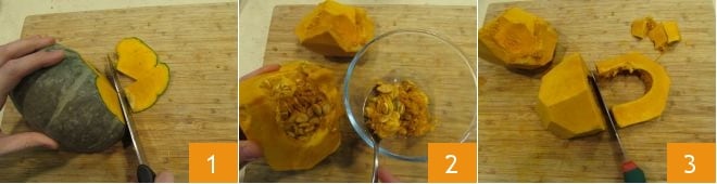 Um die Kürbis- und Karottensuppe zuzubereiten, beginnen Sie mit dem Putzen des Kürbisses. Entfernen Sie mit einem Messer die Schale 1, teilen Sie ihn dann in zwei Hälften und entfernen Sie mit einem Löffel die inneren Samen 2. Schneiden Sie den Kürbis zunächst in Scheiben 3