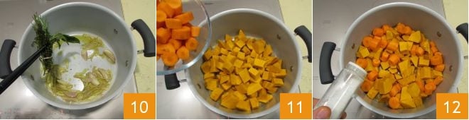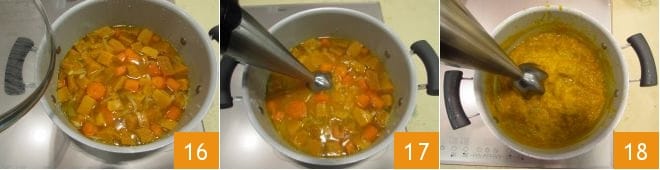 Sobald sowohl der Kürbis als auch die Karotten gar sind 16, schalten Sie die Flamme aus und pürieren Sie alles mit einem Stabmixer (17-18), bis eine glatte und homogene Creme entsteht.