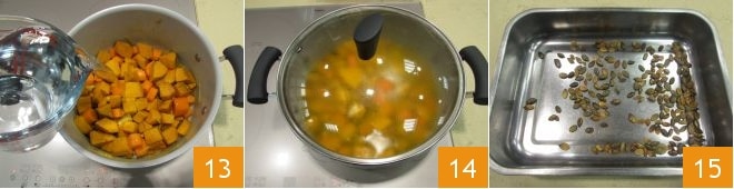 Gießen Sie dann das Wasser ein 13, decken Sie den Topf mit einem Deckel ab 14 und lassen Sie es etwa 40 Minuten kochen. In der Zwischenzeit rösten Sie auch die Kürbiskerne: Legen Sie sie in eine Auflaufform und backen Sie sie bei 190° für etwa 15 Minuten, bis sie gut gebräunt sind 15, dann beiseite stellen.
