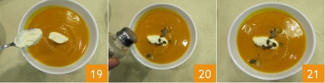 Richten Sie die Samtsuppe an und garnieren Sie das Gericht mit einem Löffel saurer Sahne 19, Kürbiskernen und einer Prise schwarzem Pfeffer 20. Genießen Sie Ihre Kürbis- und Karottensuppe noch heiß 21.