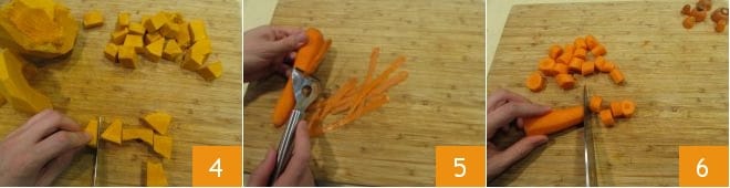 und dann in Würfel 4, davon erhalten Sie etwa 850 g. Gehen Sie zu den Karotten über, schälen Sie sie 5 und schneiden Sie sie in etwa 1,5 cm dicke Scheiben 6.