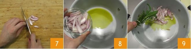 Bereiten Sie das Kräutersträußchen vor, indem Sie Salbei, Thymian und Rosmarin mit einem Stück Schnur zusammenbinden. Schneiden Sie die Schalotte in Scheiben 7 und geben Sie diese in einen Topf, in dem Sie bereits das Öl 8 gegossen haben. Fügen Sie die Kräuter hinzu 9 und lassen Sie alles bei schwacher Hitze etwa 10 Minuten goldbraun werden.