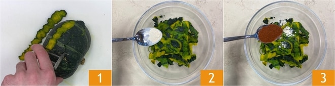Um die Kürbisschalen-Chips herzustellen, waschen Sie zuerst den Kürbis gut und schälen dann die Schale mit einem Sparschäler ab 1. Geben Sie die Schalen in eine Schüssel und würzen Sie sie mit Knoblauchpulver 2 und Paprika 3.