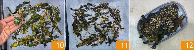 Bestreuen Sie zusätzlich mit gehackten Rosmarinnadeln 10 und backen Sie sie im vorgeheizten statischen Ofen bei 180° für etwa 25-30 Minuten. Herausnehmen 11 und Ihre Kürbisschalen-Chips sofort servieren 12!