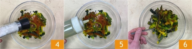 Fügen Sie auch das Salz 4 und das Öl 5 hinzu und mischen Sie gut 6.