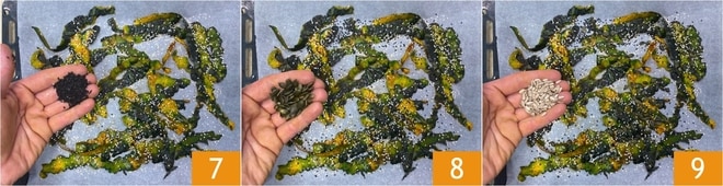 Verteilen Sie die so gewürzten Schalen auf einem mit Backpapier ausgelegten Blech und garnieren Sie sie dann mit weißen und schwarzen Sesamsamen 7, Kürbiskernen 8 und Sonnenblumenkernen 9.