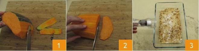 Um die Kürbisschnitzel zuzubereiten, beginnen Sie damit, den Kürbis zu schälen, sodass Sie 450 g Fruchtfleisch erhalten 1. Schneiden Sie ihn in Scheiben von etwa einem halben cm Dicke 2. Dann machen Sie mit der Panade weiter. Geben Sie das grob gemahlene Paniermehl, den Käse, dann Salz und Pfeffer in eine Schüssel 3,