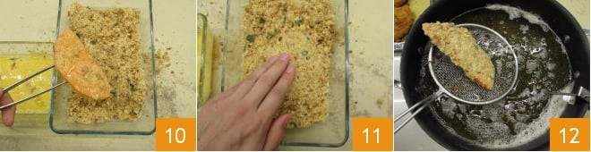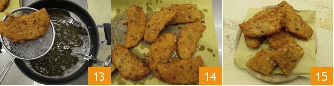 und dann nochmals in die Paniermehlmischung 10. Drücken Sie erneut, damit sie gut haftet und wiederholen Sie den gleichen Vorgang für alle anderen Scheiben 11. Jetzt können Sie mit dem Braten fortfahren: erhitzen Sie das Öl auf 165°C und tauchen Sie 1 oder 2 Stücke gleichzeitig ein 12.