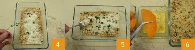 zupfen Sie dann den frischen Oregano 4 und mischen Sie alles 5. An diesem Punkt können Sie die Kürbisscheiben panieren. Wenden Sie sie zuerst in den verquirlten Eiern 6,