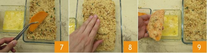dann in der Paniermehlmischung 7 und drücken Sie mit den Händen, damit die Panade gut haftet 8. Dann wiederholen Sie den Vorgang, indem Sie das Schnitzel zuerst erneut in die Eier tauchen 9