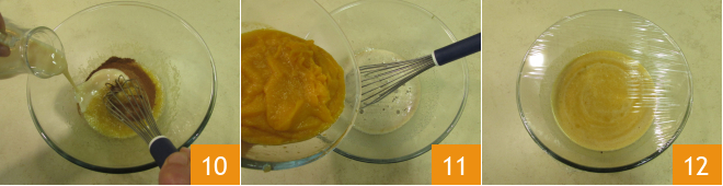 Gießen Sie die Kondensmilch 10 hinzu und zum Schluss die Kürbiscreme 11. Decken Sie die Mischung mit Frischhaltefolie ab und lassen Sie die Füllung mindestens 1 Stunde im Kühlschrank ruhen. Dieser Schritt dient dazu, den Schaum zu absorbieren, der beim Schlagen der Eier entsteht 12.