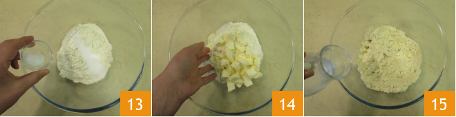 Bereiten Sie in der Zwischenzeit den Mürbeteig zu. Geben Sie das Mehl in eine Schüssel und fügen Sie den Zucker und das Salz hinzu 13. Fügen Sie dann die kalten Butterstücke hinzu und arbeiten Sie mit den Fingerspitzen, um die Butter nicht zu sehr zu erwärmen 14. Wenn der Teig krümelig ist, gießen Sie nach und nach das kalte Wasser hinzu 15