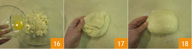 und danach das Ei 16. Wenn der Teig fest geworden ist, übertragen Sie ihn auf die Arbeitsfläche und kneten ihn mit noch etwas Mehl, aber übertreiben Sie es nicht, das Wichtigste ist, einen glatten und homogenen Teigball zu erhalten 17. Wickeln Sie ihn dann in Frischhaltefolie und lassen ihn eine Stunde im Kühlschrank ruhen 18.