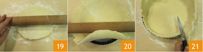 Nach der Ruhezeit nehmen Sie den Mürbeteig und rollen ihn auf der bemehlten Arbeitsfläche mit dem Nudelholz aus 19. Sie erhalten eine Scheibe, die etwas größer ist als die Form von 25 cm, mit herausnehmbarem Boden, in die Sie den auf dem Nudelholz aufgerollten Teig legen können 20. Entfernen Sie die überschüssigen Teigreste 21
