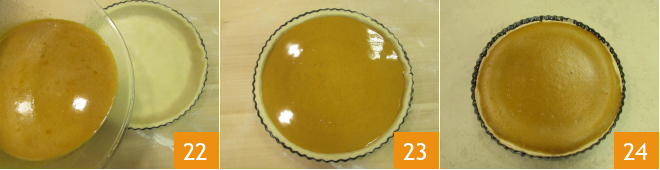 Die Creme ist sehr flüssig, Sie können die Form auf ein Backblech stellen, bevor Sie die Füllung in die Tortenform gießen 22 und im vorgeheizten statischen Ofen bei 175°C für etwa 55 Minuten backen 23. Aus dem Ofen nehmen, abkühlen lassen und dann die Pumpkin Pie herauslösen und servieren 24. Sie können jedes Stück mit einem Löffel Schlagsahne begleiten!