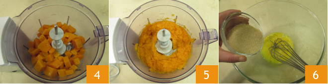 Geben Sie ihn dann in den Mixer 4 und pürieren ihn zu einem glatten Brei 5. In der Zwischenzeit beginnen Sie in einer Schüssel, die Eier mit dem Kristallzucker mithilfe eines manuellen Schneebesens zu schlagen 6