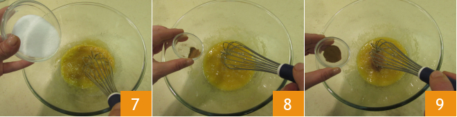 Fügen Sie dann den braunen Zucker 7, Zimt 8 und Muskatnuss 9 hinzu.