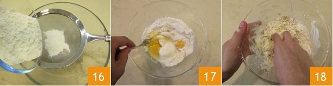 Am nächsten Tag bereiten Sie den frischen Teig zu: sieben Sie das Mehl in eine sehr große Schüssel 16 oder auf eine Arbeitsfläche und fügen Sie die Eier bei Raumtemperatur hinzu, die schnell mit einer Gabel aufgeschlagen wurden 17 und vermengen Sie die Zutaten von Hand, bis Sie eine weiche und nicht klebrige Mischung erhalten 18. Wenn es noch klebrig ist (dies kann von der Absorptionsfähigkeit des verwendeten Mehls abhängen), fügen Sie noch etwas mehr Mehl hinzu, ohne zu übertreiben; wenn der Teig hingegen trocken ist, können Sie ihn anfeuchten, indem Sie etwas Wasser bei Raumtemperatur hinzufügen. Es ist auch ratsam, die Eimenge wie angegeben zu respektieren, um die perfekte Konsistenz des Eiernudelteigs zu erreichen.