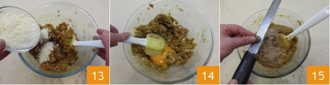 und geben Sie auch den geriebenen Käse hinzu 13, vermengen Sie gut und fügen Sie auch das Ei hinzu 14. Sobald dieses von der Füllung aufgenommen wurde, salzen Sie nach Belieben und würzen Sie mit Muskatnuss 15. Decken Sie es mit Folie ab und lassen Sie es über Nacht im Kühlschrank ruhen, besser noch für 24 Stunden.