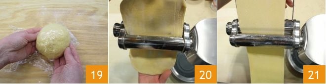 Geben Sie dem Teig eine kugelige Form 19 und wickeln Sie ihn in Frischhaltefolie. Lassen Sie ihn an einem kühlen Ort mindestens 30 Minuten bei Raumtemperatur ruhen. Nach der erforderlichen Zeit nehmen Sie den Teig und teilen Sie ihn mindestens in zwei Teile (während Sie ihn bearbeiten, lassen Sie den noch zu bearbeitenden Teil mit Folie bedeckt); mit der Nudelmaschine oder einem Nudelholz, rollen Sie jedes Teigstück zu rechteckigen Stücken von etwa 2 mm Dicke aus (20-21).
