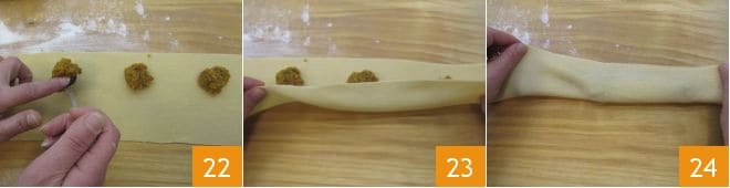 Rollen Sie den ausgerollten Teig auf einer leicht bemehlten Arbeitsfläche aus, gleichen Sie den Teig mit einem Teigrädchen aus, um einen 9 cm breiten Streifen zu erhalten, und legen Sie darauf kleine Häufchen von etwa 15 g Füllung in den oberen Teil des Streifens (lassen Sie mindestens 1 cm vom Rand entfernt) und lassen Sie zwischen jedem Häufchen ein paar Zentimeter Abstand entlang des gesamten Streifens frischen Nudelteig 22. Falten Sie den frischen Nudelteigstreifen, um die Füllung zu bedecken (23-24): wenn der Teig etwas trocken ist, können Sie ihn leicht mit etwas Wasser bestreichen.