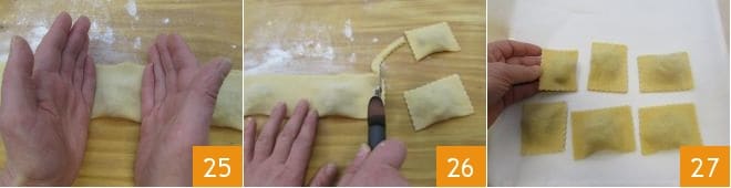 Drücken Sie zwischen den Abständen der Füllungshäufchen, um die Ränder des Teigs zu verbinden 25, bevor Sie die Tortelli mit einem gezackten Teigrädchen ausschneiden 26: die Form und die Größe der Tortelli können je nach Geschmack und Tradition variieren. Wir haben rechteckige Stücke von 4,5x6 cm erhalten. Während Sie die Tortelli herstellen, legen Sie sie auf ein Tablett, das mit Papier oder einem trockenen, leicht bemehlten Küchentuch ausgelegt ist 27. Fahren Sie so fort, bis Sie den frischen Teig und die Füllung aufgebraucht haben: Am Ende erhalten Sie etwa 40 Tortelli.