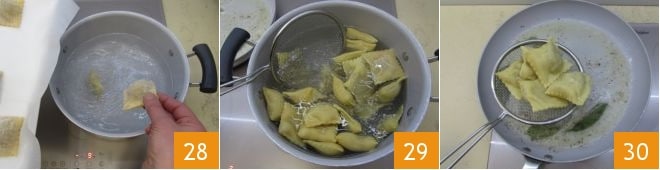 Dann setzen Sie einen großen Topf mit gesalzenem Wasser nach Geschmack auf das Feuer. Bereiten Sie dann das Dressing vor, indem Sie in einer sehr großen Pfanne die Butter mit dem Salbei schmelzen lassen, leicht salzen und das Feuer ausschalten, wenn es vollständig geschmolzen ist, wobei Sie darauf achten, dass es nicht verbrennt. Wenn das Wasser kocht, tauchen Sie die Kürbistortelli hinein, um sie zu kochen 28: es reichen 3-4 Minuten. Dann schöpfen Sie sie mit einem Schaumlöffel 29 direkt in die Pfanne mit der geschmolzenen Butter und dem Salbei 30.