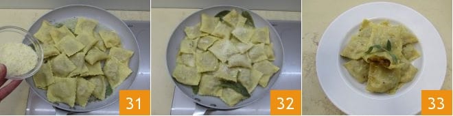 Würzen Sie mit geriebenem Käse 31, indem Sie die Tortelli vorsichtig mischen 32 und, wenn Sie möchten, mit gemahlenem Pfeffer würzen und anrichten 33: Ihre Tortelli sind bereit, genossen zu werden!