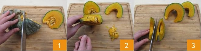 Um die Kürbistortelli zuzubereiten, beginnen Sie mit der Füllung, die mindestens über Nacht oder besser noch 24 Stunden im Kühlschrank ruhen sollte, damit sich die Aromen verbinden können. Nehmen Sie den Kürbis und teilen Sie ihn in Teile 1, um die Samen und inneren Fäden leichter zu entfernen 2. Schneiden Sie ihn dann in Scheiben 3