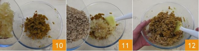 Fügen Sie dann dem Kürbis die Senffrüchte 10 und die zerbröselten Amaretti 11 hinzu und vermengen Sie sie mit einem Spatel 12