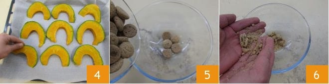 und legen Sie diese auf ein mit Backpapier ausgelegtes Backblech 4: backen Sie im vorgeheizten statischen Ofen bei 220° für etwa 20 Minuten (wenn Umluftofen bei 200° für etwa 10 Minuten). Überprüfen Sie gelegentlich das Garen, indem Sie das Fruchtfleisch mit einer Gabel anstechen: der Kürbis sollte weich sein, aber nicht verbrennen. Während der Kürbis gart, sammeln Sie die Amaretti in einer Schüssel und zerbröseln sie mit den Händen (5-6).
