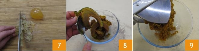 Hacken Sie die mantuanische Birnen- (oder Quitten-) Senffrüchte mit einem Messer 7. Sie können auch einen Fleischwolf verwenden, wenn Sie ein feineres Ergebnis bevorzugen. Sobald der Kürbis gekocht ist, lassen Sie ihn im ausgeschalteten Ofen abkühlen, damit er trocknet und so viel Wasser wie möglich verliert. Nehmen Sie dann das gekochte Fruchtfleisch mit einem Löffel oder einem Ausstecher heraus 8 und passieren Sie es durch eine Kartoffelpresse 9, indem Sie es in einer kleinen Schüssel sammeln.