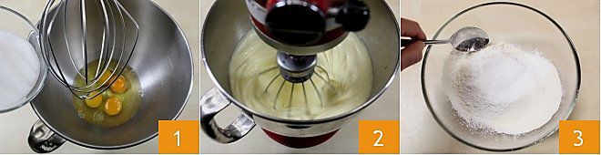 Um die Küsschen mit Kaffeecreme zuzubereiten, beginnen Sie damit, die Eier mit dem Zucker in eine Küchenmaschine (oder in eine große Schüssel) zu geben 1. Schlagen Sie die Zutaten mit dem Schneebesen, bis eine helle und schaumige Creme entsteht 2. Dann mischen Sie in einer Schüssel das gesiebte Mehl und Backpulver 3.