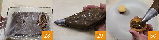 Wenn die Kaffeecreme fertig ist, schalten Sie die Hitze aus und geben Sie sie in einen Glasbehälter. Decken Sie sie mit Frischhaltefolie ab, indem Sie sie an die Creme andrücken 28, und lassen Sie alles etwa eine Stunde lang im Kühlschrank abkühlen. Nach der erforderlichen Zeit füllen Sie eine Spritzbeutel mit Sterntülle mit der nun abgekühlten Kaffeecreme 29, indem Sie sich mit einem Spatel oder einem Löffel helfen. Nehmen Sie dann die inzwischen abgekühlten Kekse und beginnen Sie, die Hälfte davon mit der Kaffeecreme zu füllen 30.