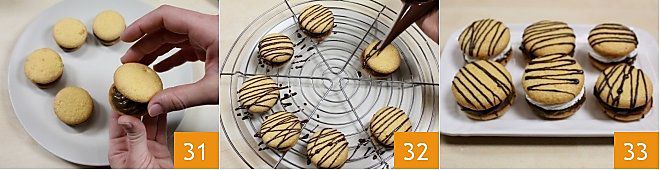 Nun legen Sie auf jede gefüllte Hälfte die übrigen Kekse, um Ihre Küsschen zu erstellen 31. Übertragen Sie sie dann auf ein Gitter und verfeinern Sie sie mit geschmolzener Schokolade, indem Sie kleine Zierstreifen auf jedes Küsschen zeichnen, wobei Sie sich mit einem Papierkegel helfen 32. Um einen Papierkegel herzustellen, können Sie das Kochschulblatt konsultieren: como man einen Papierkegel herstellt. Wenn Sie möchten, können Sie etwas flüssige frische Sahne mit Puderzucker schlagen und Ihre Küsschen mit der Schlagsahne zusätzlich zur Kaffeecreme füllen, um sie noch weicher und schmackhafter zu machen 33!