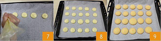 Legen Sie ein Backblech mit Backpapier aus und beginnen Sie, die Creme mit dem Spritzbeutel zu verteilen, um etwa 3 cm große Teigscheiben zu formen 7, wobei Sie darauf achten, sie einige Zentimeter voneinander entfernt zu platzieren 8. Backen Sie sie im vorgeheizten statischen Ofen bei 190° für mindestens 12 Minuten (bei Umluftofen 170° für etwa 6 Minuten) oder bis die Scheiben leicht aufgegangen sind und beginnen, an den Rändern goldbraun zu werden. Nehmen Sie dann das Blech aus dem Ofen und lassen Sie die erhaltenen Kekse abkühlen 9.