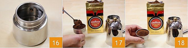 Bereiten Sie dann den Kaffee vor, den Sie der Creme hinzufügen: Füllen Sie kaltes, möglichst kalkarmes Wasser in den Kessel bis zum Sicherheitsventil 16 (sonst entsteht ein längerer Kaffee). Füllen Sie den Filter mit gemahlenem Kaffee 17 und glätten Sie nach jedem hinzugefügten Löffel Kaffee, indem Sie den Filter mit entschiedenen Bewegungen auf den Tisch klopfen 18, bis Sie den Rand des Filters erreichen.