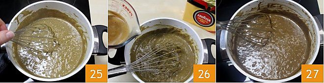 Jetzt nehmen Sie den Topf mit der Kaffeecreme, die Sie bei niedriger Hitze unter Rühren mit dem Schneebesen eingedickt haben 25, und fügen Sie den Kaffee mit der aufgelösten Gelatine hinzu 26. Rühren Sie mit dem Schneebesen um, und falls die Creme zu flüssig sein sollte, stellen Sie den Topf wieder bei niedriger Hitze auf den Herd, um sie unter kontinuierlichem Rühren mit dem Schneebesen einzudicken 27.